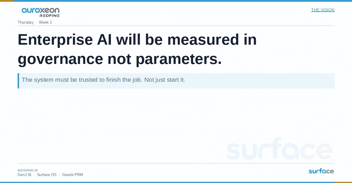 Auroxeon was founded on a thesis developed over decades in distributed systems, kernel engineering, and formal specification: that AI would eventually require an operating system layer. SurfaceOS is that layer—governed execution beneath frontier models.